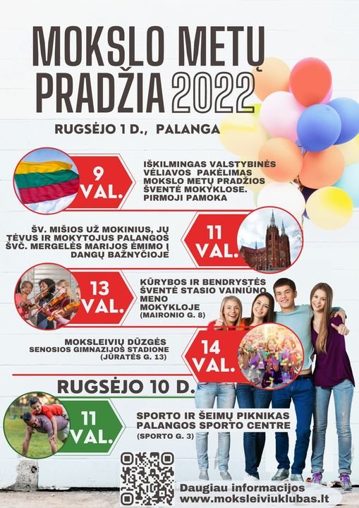 Šiemet kurorto moksleiviams, jų tėveliams bei mokytojams, taip pat visai Palangos bendruomenei bus padovanotos dvi su naujaisiais mokslo metais susijusios šventės: Mokslo metų pradžios (ją rengia Moksleivių klubas su partneriais) rugsėjo 1 dieną, o rugsėjo 10-ąją Sporto centras savo stadione kviečia į sporto ir šeimų pikniką.