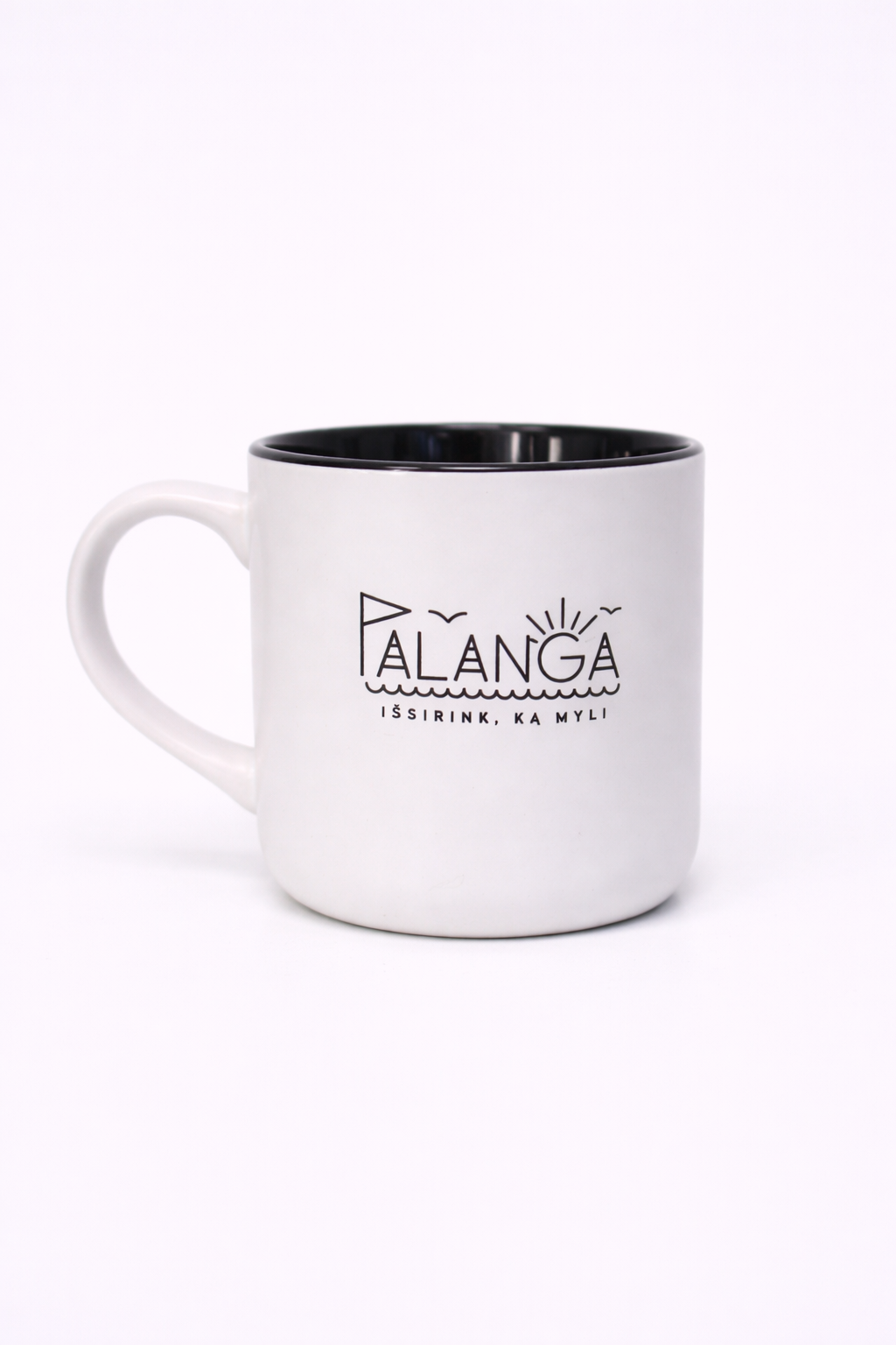Keramikinis matinis baltas puodelis spalvotu vidumi su Palangos logotipu „Išsirink ką myli“.