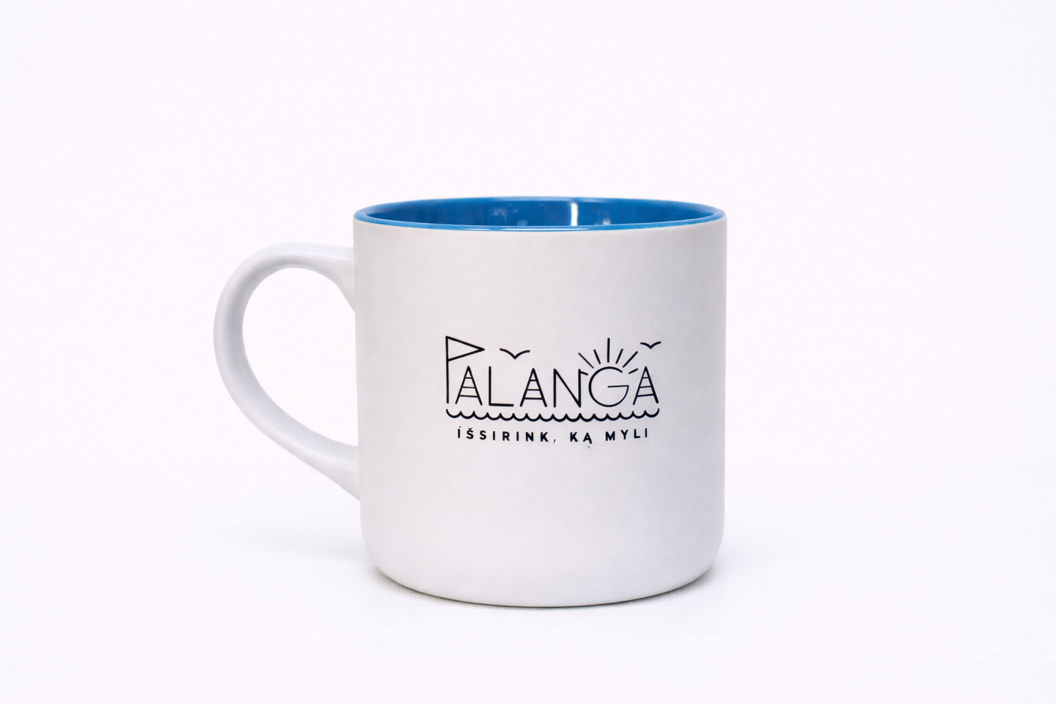 Keramikinis matinis baltas puodelis spalvotu vidumi su Palangos logotipu „Išsirink ką myli“.