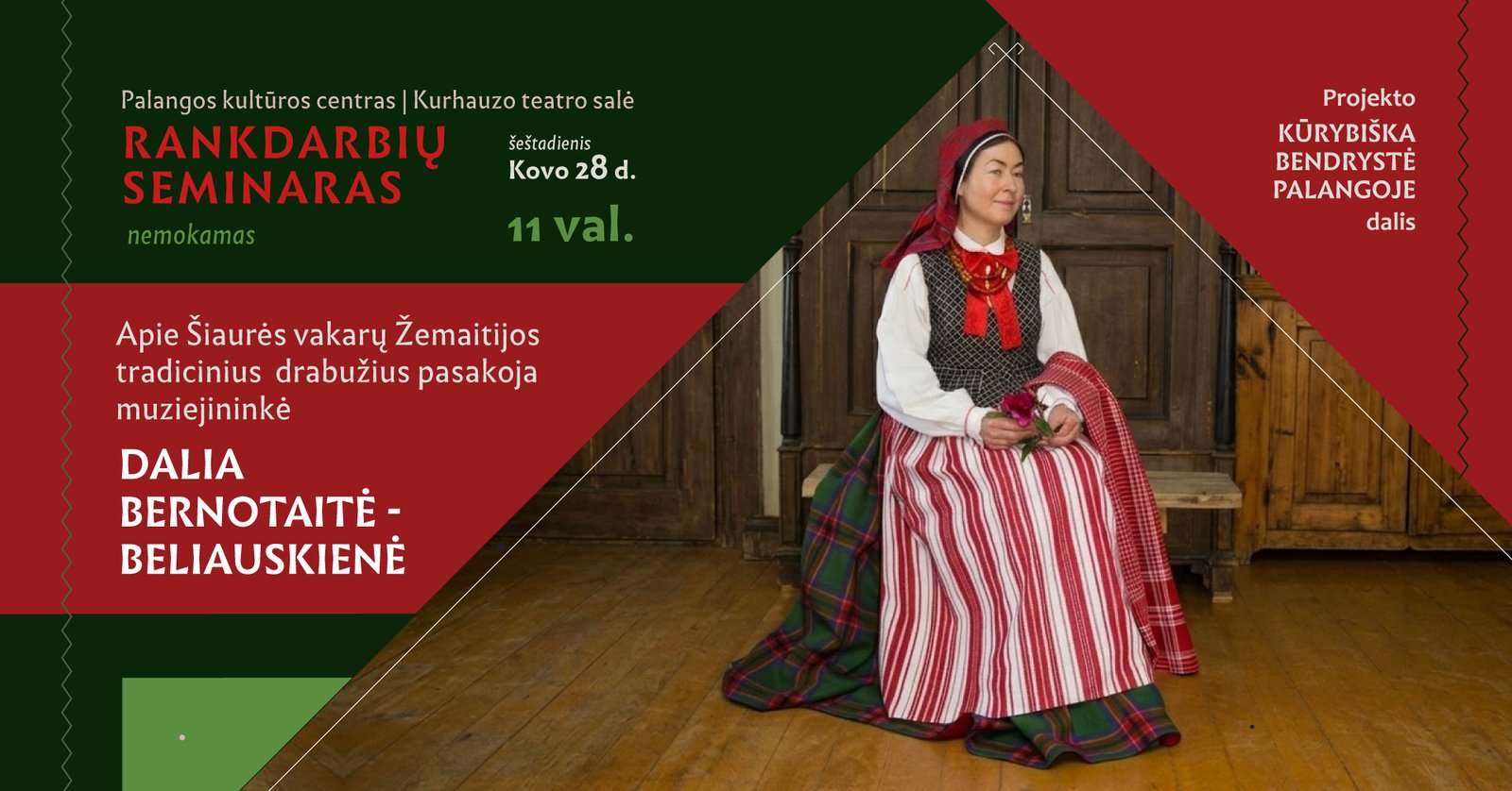 Palangos krašto etnoklubo „Mėguva“ „Palangos rankdarbių meistarnė“ tęsia projekto „Kūrybiška bendrystė Palangoje“ tradicinės tekstilės mokymų ciklą. Maloniai kviečiame į susitikimą. Fotografuoti ir filmuoti nebus galimybės dėl autorinių teisių.