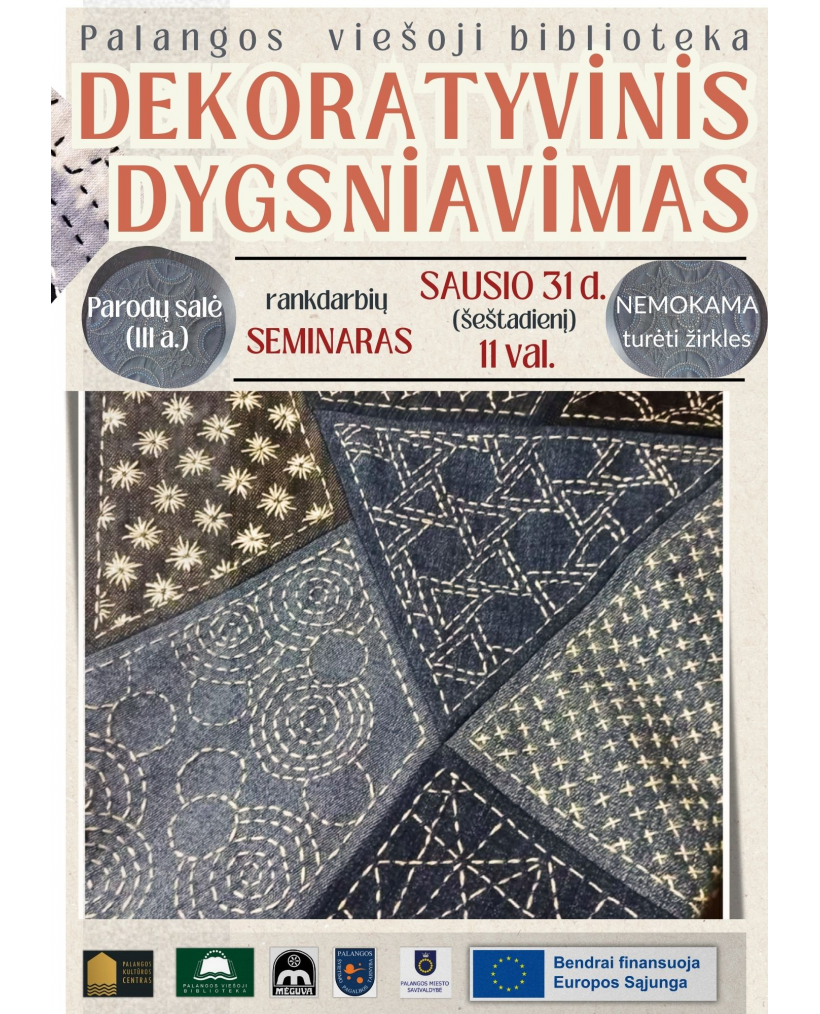 Palangos krašto etnoklubas „Mėguva“ pradeda projekto „Kūrybiška bendrystė Palangoje“ tradicinės tekstilės mokymų ciklą. Į pirmąjį susitikimą išbandyti ir pramokti įvairių dygsniavimo technikų sausio 31 d. (šeštadienį) 11 val. kviečia Palangos rankdarbių meistarnė. Seminaras vyks Palangos viešosios bibliotekos parodų salėje, kur eksponuojama skiautinių klubo „Viskas marga“ paroda „Mėlyna“. Seminaro metu dalyviai turės galimybę susitikti ir pabendrauti su parodos autorėmis.