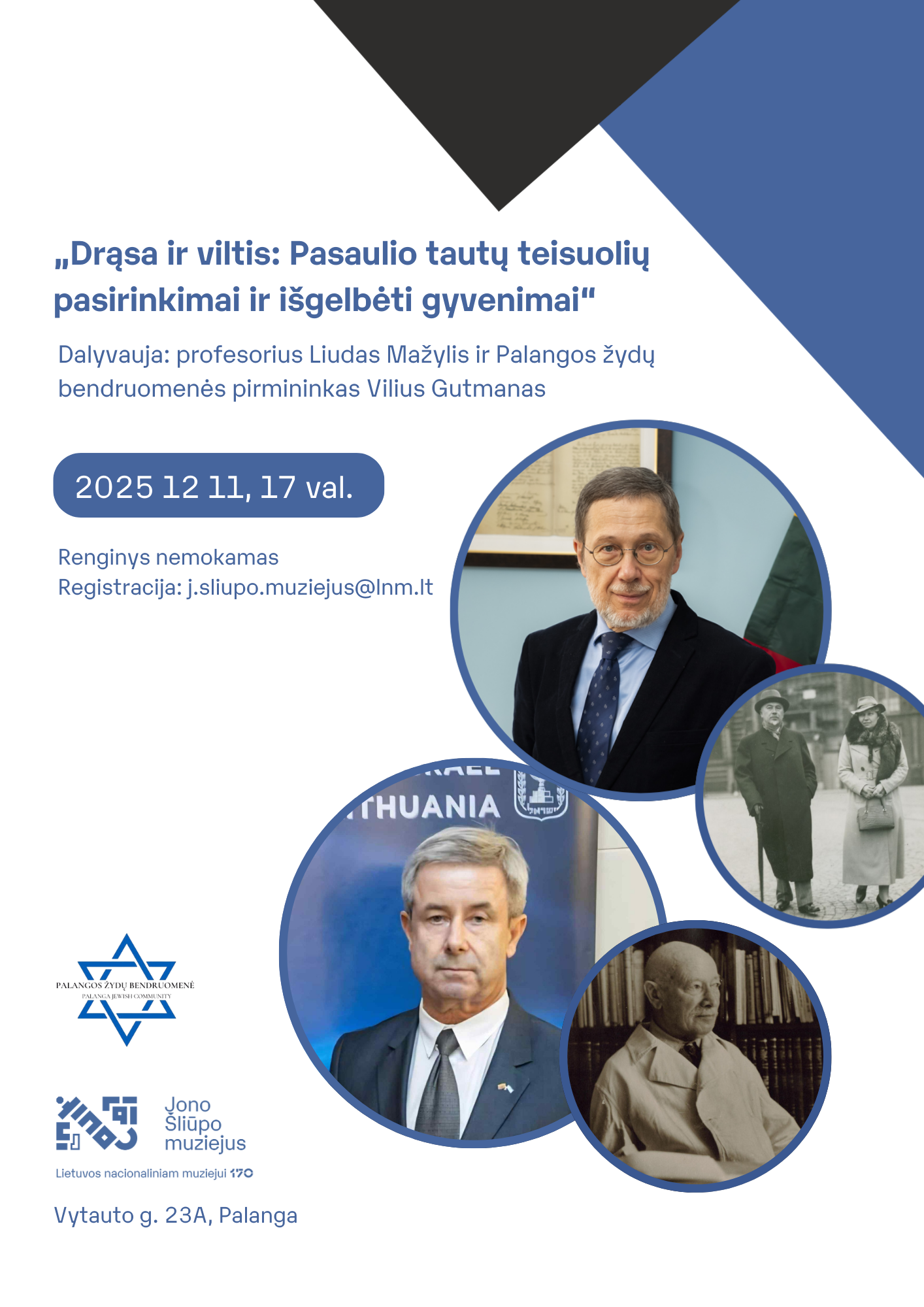 Palangos žydų bendruomenė kartu su Lietuvos nacionalinio muziejaus padaliniu – Palangos burmistro Jono Šliūpo muziejumi – gruodžio 11 d. 17 val. kviečia į susitikimą „Drąsa ir viltis: Pasaulio tautų teisuolių pasirinkimai ir išgelbėti gyvenimai“. Renginio metu Europos Parlamento narys, profesorius Liudas Mažylis dalinsis įžvalgomis apie žydų gelbėtojų ryžtą Antrojo pasaulinio karo metais, istorinių dokumentų ir atminimo svarbą šiandien. Kartu dalyvaus Palangos žydų bendruomenės pirmininkas Vilius Gutmanas, kuriam ši tema – asmeniškai artima ir gyva. Tai vakaras, skirtas ne tik istorijai, bet ir klausimui, kurį svarbu išgirsti kiekvienam iš mūsų: ar ir šiandien, ištikus išbandymui, pasirinktume drąsą?