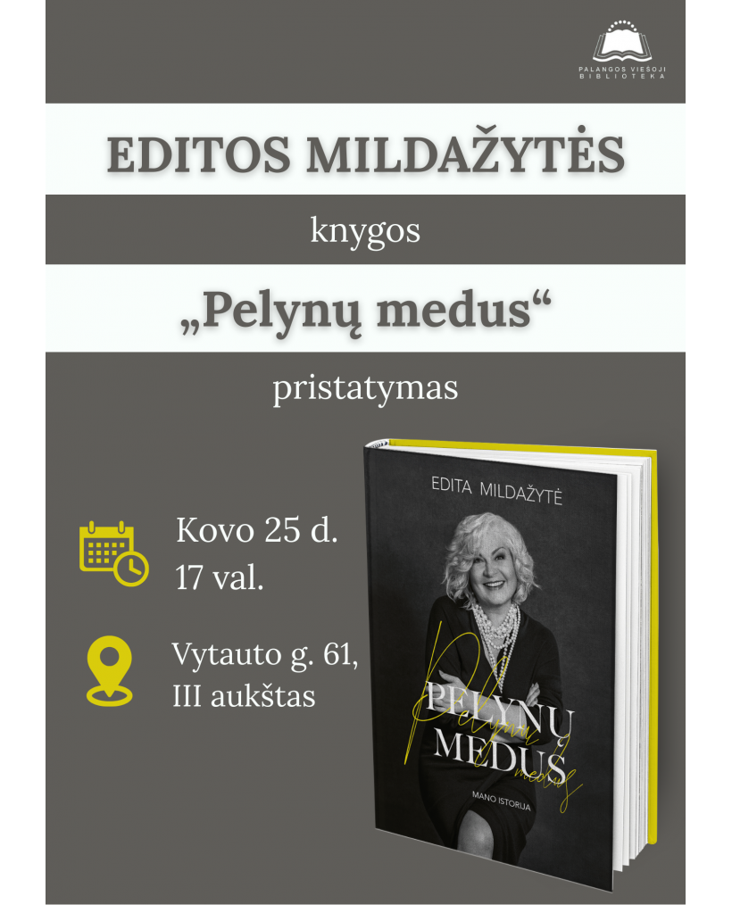 Kovo 25 d. 17 val. Palangos viešosios bibliotekos renginių salėje (III a.) vyks susitikimas su žurnaliste, televizijos laidų kūrėja ir visuomenės veikėja Edita Mildažyte. Renginio metu bus pristatyta jos autobiografinė knyga „Pelynų medus. Mano istorija“.
