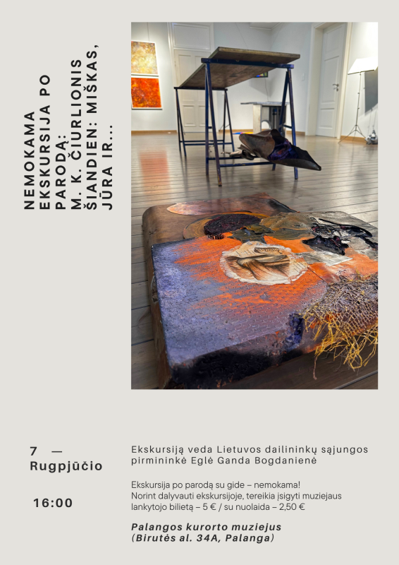 Menininkai, įkvėpti M. K. Čiurlionio vizijų, gamtos temų ir filosofinių gelmių, pristato darbus įvairiomis technikomis – nuo tapybos iki instaliacijų. Miškas. Jūra. Ir dar… – tai temos, kurios parodoje atgyja naujais, netikėtais pavidalais, įtraukiančiais žiūrovą į gilesnį ryšį su gamta, kultūra ir pačiu savimi. Nepraleiskite progos išgirsti gyvą meno pasakojimą ir pamatyti, kaip M. K. Čiurlionis įkvepia kūrėjus šiandien.