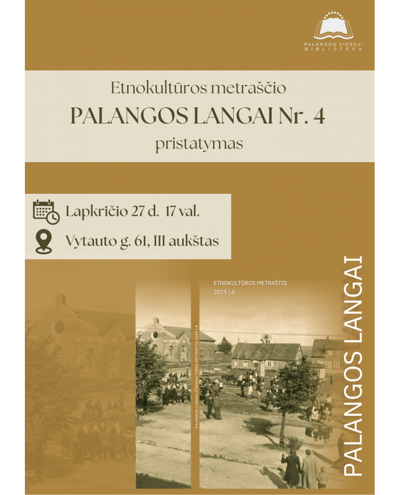 Kviečiame į ketvirtojo etnokultūros metraščio „Palangos langai“ pristatymą, kuris vyks lapkričio 27 d. 17 val. Palangos viešojoje bibliotekoje. Renginyje dalyvaus leidinio sudarytojai ir tekstų autoriai.