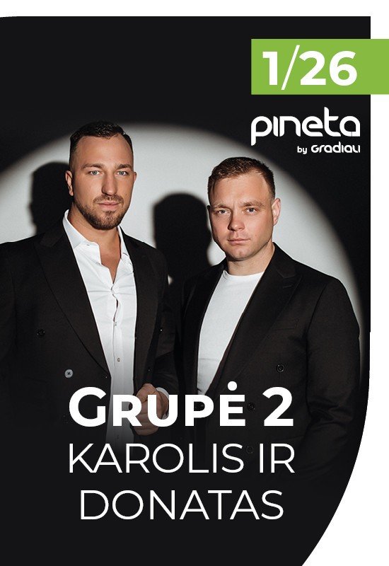 Norėtumėte į Naujuosius metus įsivažiuoti su dviguba jėga? Atvykite į energingą dueto „Grupė 2” koncertą „Pineta“ restorane sausio 26 dieną! Karolis ir Donatas – ne vieną dešimtmetį scenoje dirbantys, skirtingų kartų gerbėjų puikiai žinomi atlikėjai, savo charizma ir nuostabiais balsais dovanojantys nepamirštamą ir jau hitais tapusių dainų vakarą!