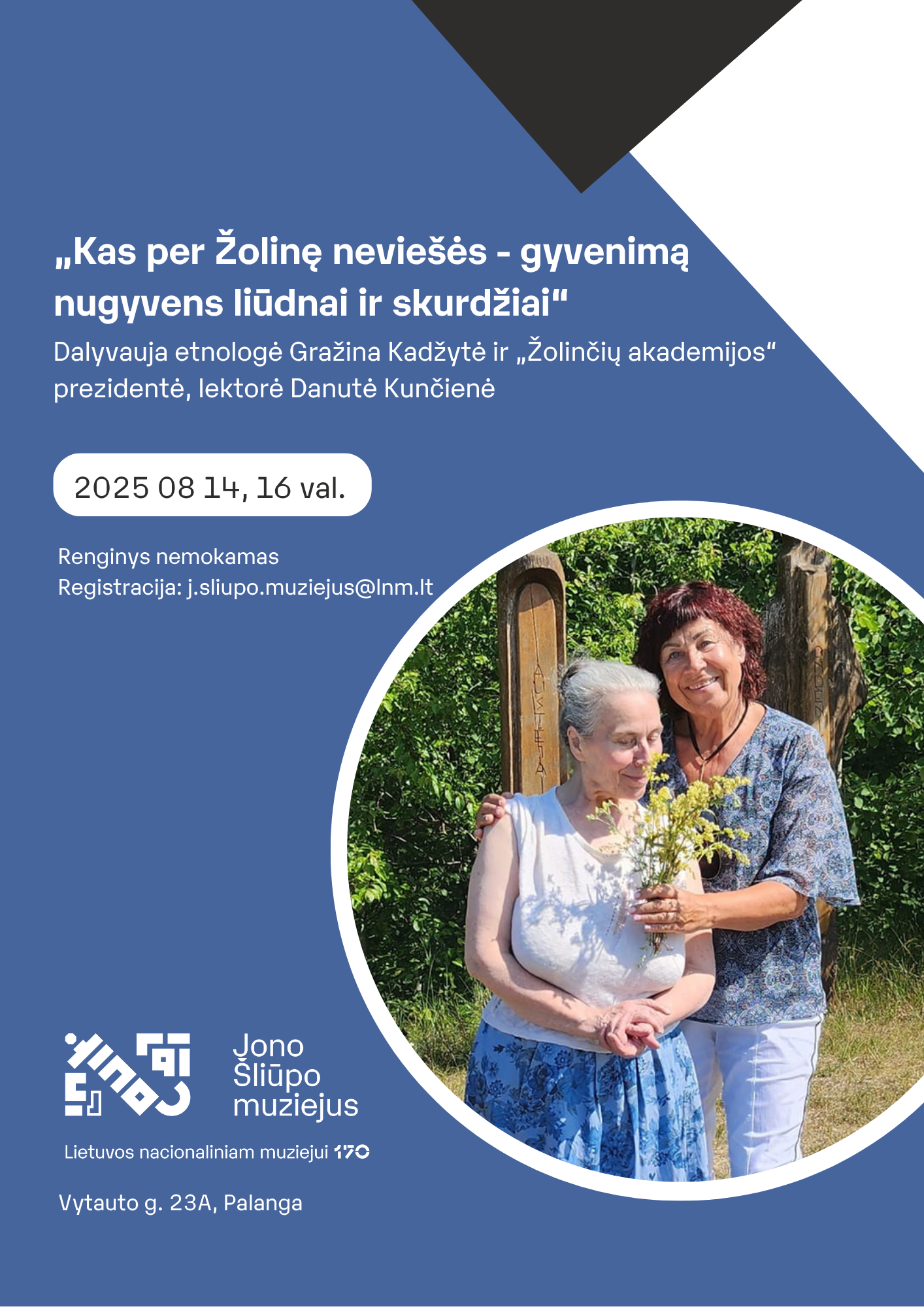 „Kas per Žolinę neviešės – gyvenimą nugyvens liūdnai ir skurdžiai“ – primena patarlių išmintis. Norinčius to išvengti maloniai kviečiame pasisvečiuoti Jono Šliūpo muziejuje, kur su etnologe Gražina Kadžyte ir „Žolinčių akademijos“ prezidente, sveikos gyvensenos puoselėtoja, lektore Danute Kunčiene kalbėsimės apie Žolinės meto padėkos raiškas: apeigines žolynų puokštes, obuolių simboliką bei kitus padėkos už šiemetį derlių ir žmonių bendrystę ženklus.