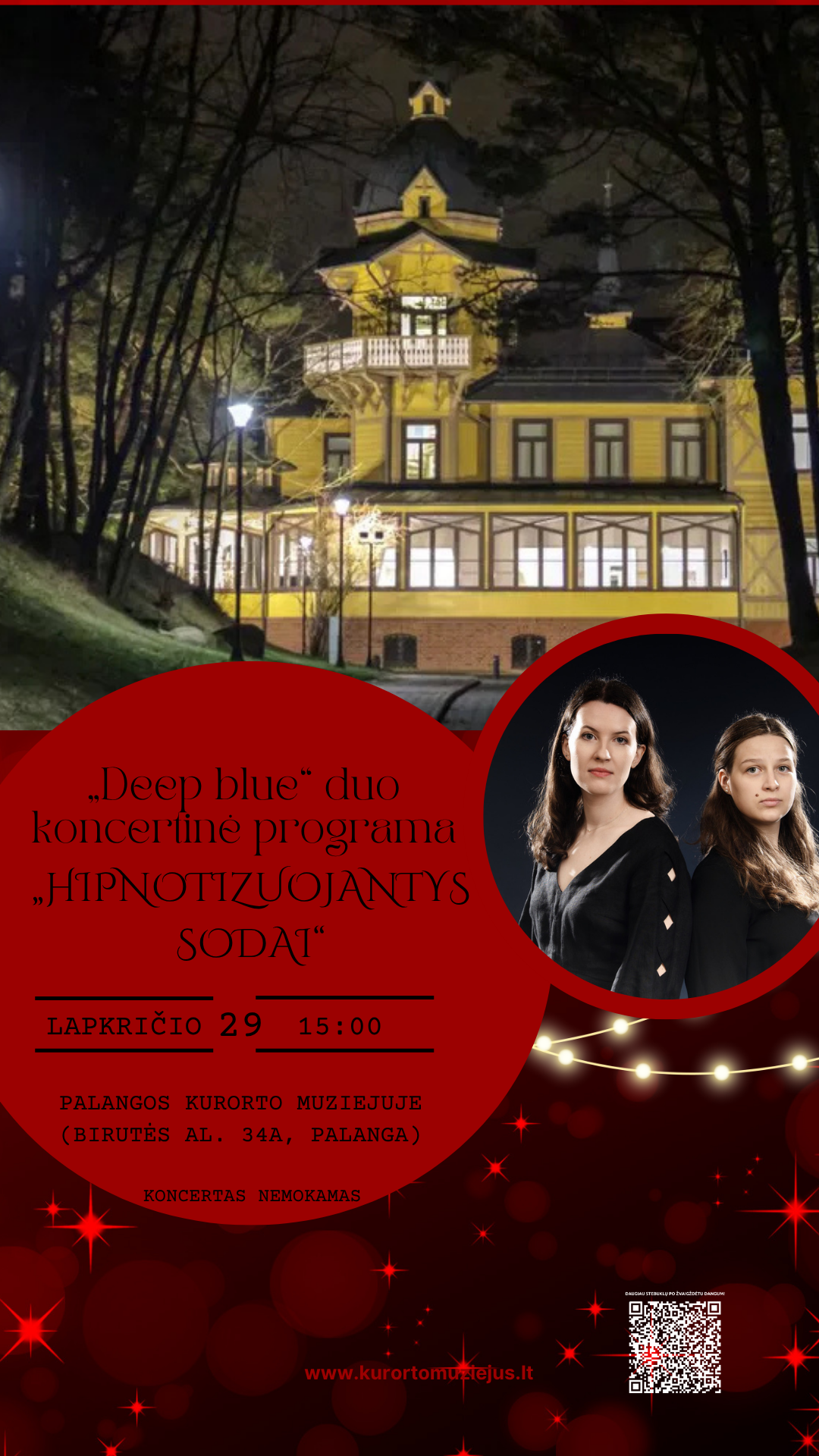 Kasmet, artėjant advento pradžiai, Palangos kurorto muziejus kviečia visus muziejaus bičiulius susitikti stebuklingoje popietėje su nuostabiais muzikos garsais. Šį kartą koncerte „Advento šviesoje“ svečiuosis Augustės Ivanauskienės (fleita) ir Liucilės U. Vilimaitės (arfa) duetas „Deep blue“, kviesiantis žiūrovus pasinerti į užburiančią muzikinę programą „Hipnotizuojantys sodai“. Renginys vyks lapkričio 29 d. 15 val. Palangos kurorto muziejuje.