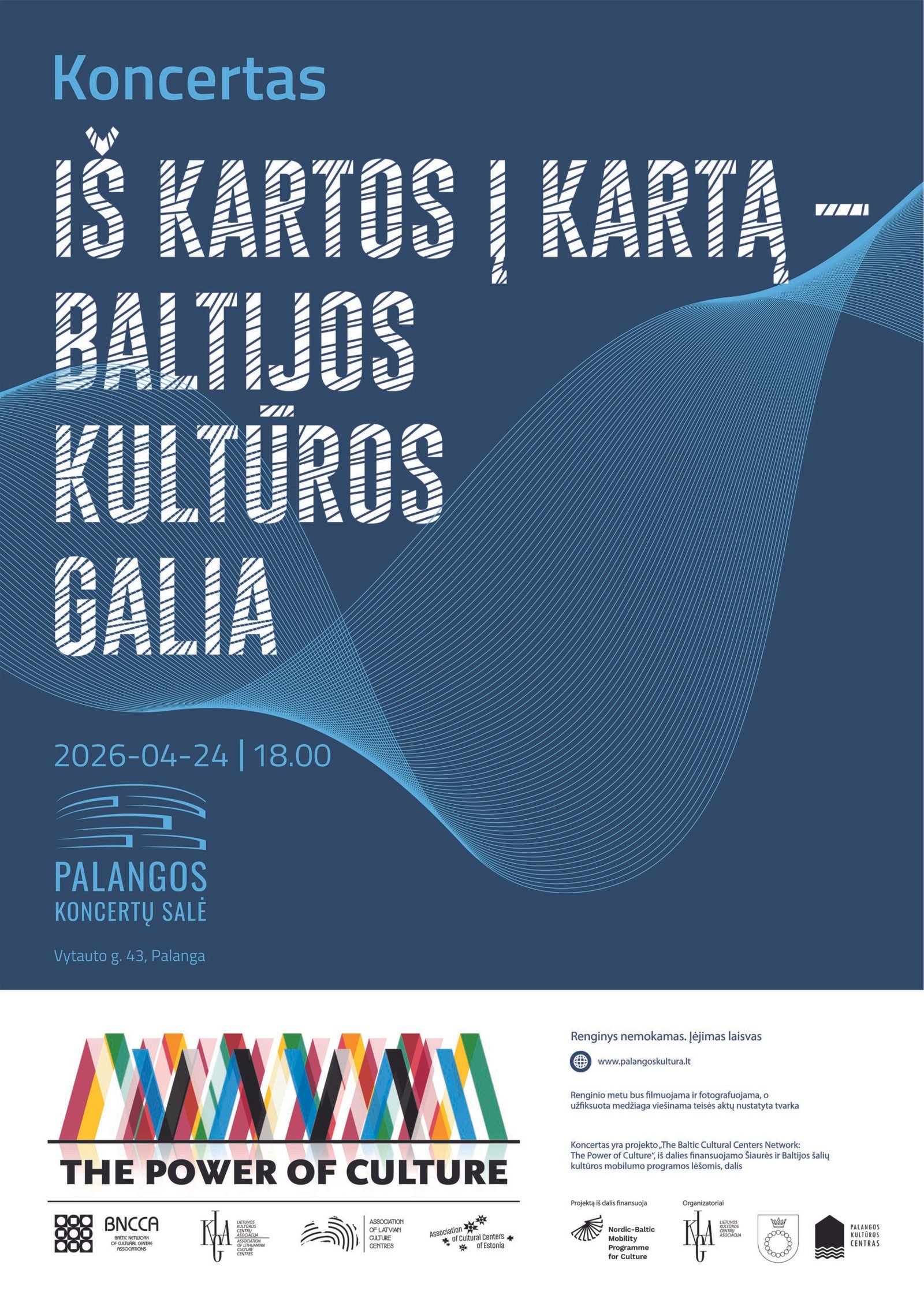 Balandžio 24 d. 18 val. Palangos koncertų salėje įvyks išskirtinis renginys „Iš kartos į kartą – Baltijos kultūros galia“. Lietuvos kultūros centrų asociacijos (LKCA) kartu su Palangos kultūros centru organizuojamas koncertas taps ne tik tarptautinio projekto kulminacija, bet ir gyvu įrodymu, kaip kultūra sujungia bendruomenes, kartas ir valstybes.