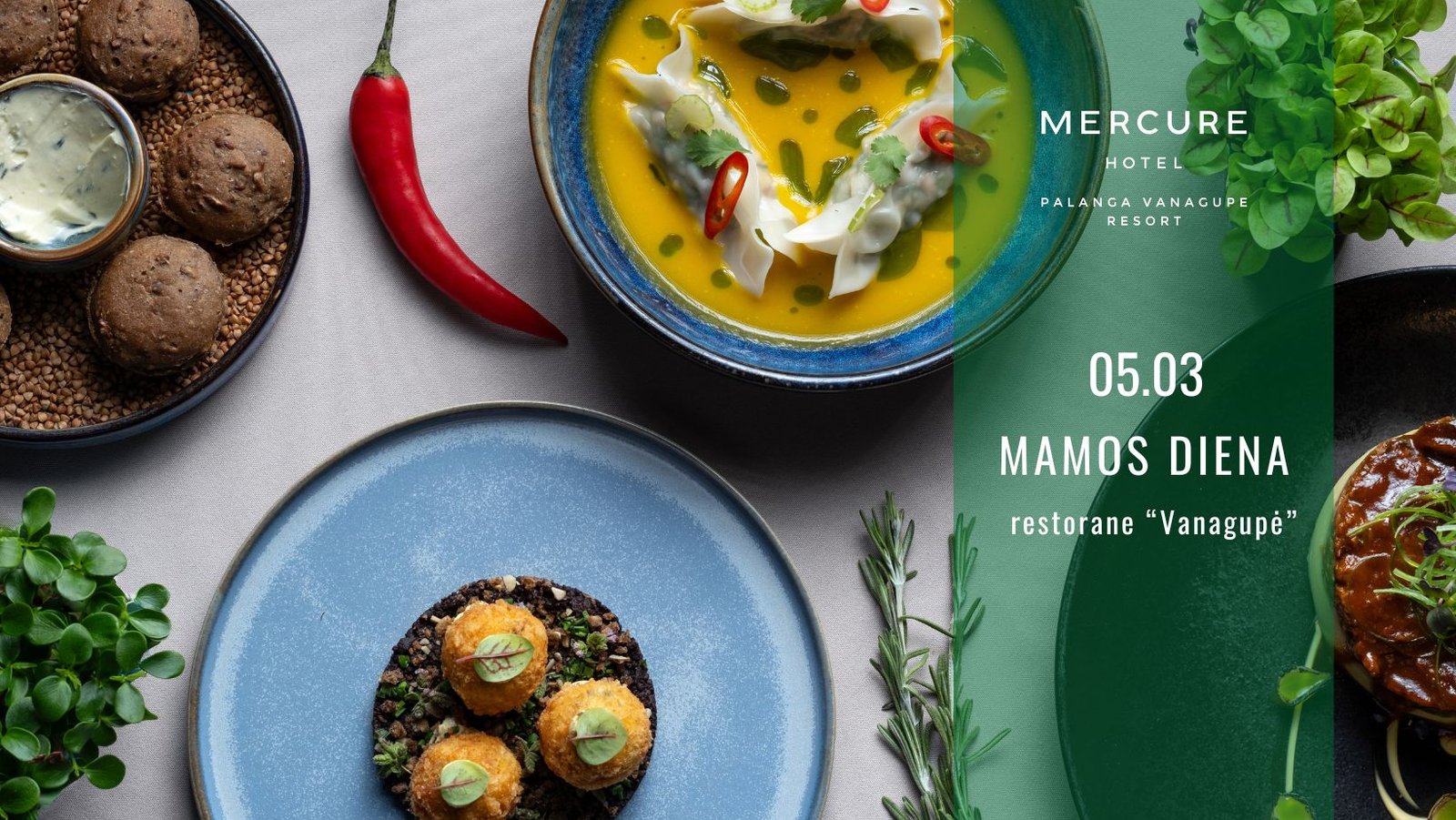 Gegužės 3-iąją, Mamos dieną, laukiame Jūsų Mercure Palanga Vanagupe Resort viešbučio restorane kartu su Jūsų brangiausiu žmogumi – Mama. Pakvieskite mamą šventinių pietų ar vakarienės, o mes pasirūpinsime jaukia aplinka, gardžiais patiekalais bei pavaišinsime ją desertu!