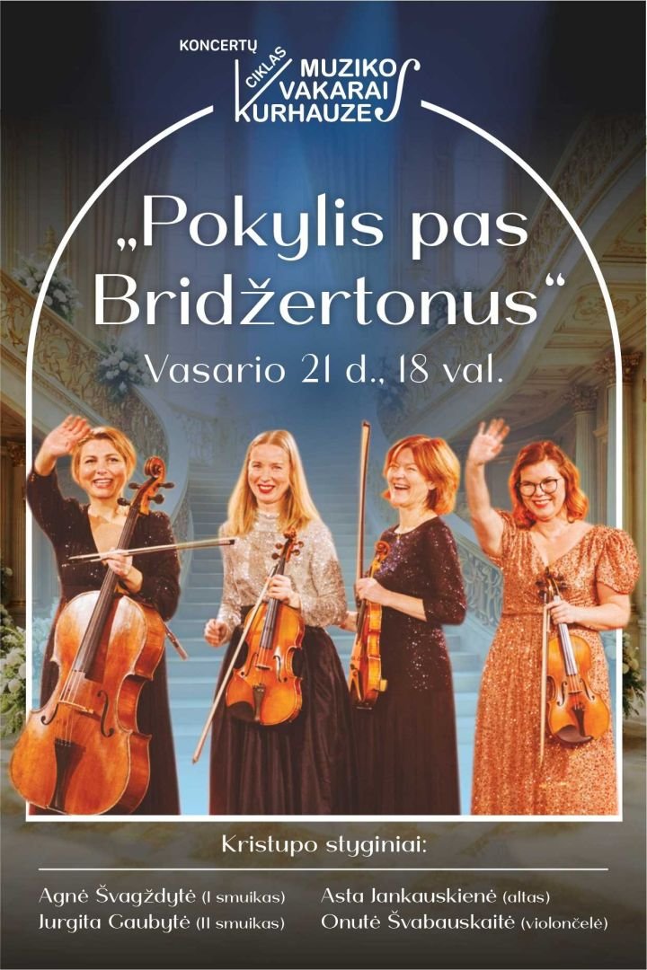 Norite pasijusti serialo „Bridžertonai“ (angl. „Bridgerton“) herojais? Pasipuoškite ir vasario 21 d. 18 val. ateikite į Palangos kurhauzą! Trumpam jis virs pokylių sale, kurioje gyvai skambės pasaulį pakerėjusios dramos muzika. Populiaraus serialo epicentre – Bridžertonų šeimos narių istorijos. Jos kupinos romantikos, intrigų, XIX a. pradžios Anglijos aristokratijos gyvenimo peripetijų. Muzikaliai įspūdingą pasakojimą Palangos kultūros centro (kurhauzo) koncertų salėje ves Kristupo styginių kvartetas: Agnė Švagždytė (I smuikas), Jurgita Gaubytė (II smuikas), Asta Jankauskienė (altas), Onutė Švabauskaitė (violončelė). Greta elegantiškų menuetų, netikėtai suskambės Taylor Swift, Beyoncé, Billie Eilish ir kt. hitai, įgavę klasikinės muzikos atspalvį. Jūsų laukia tikras nuotykis, kuriame persipina praeities bei dabarties muzikos magija. Tad mielos damos, garbūs ponai, ar susitiksime Bridžertonų pasaulyje, kupiname meilės, romantikos ir muzikos?