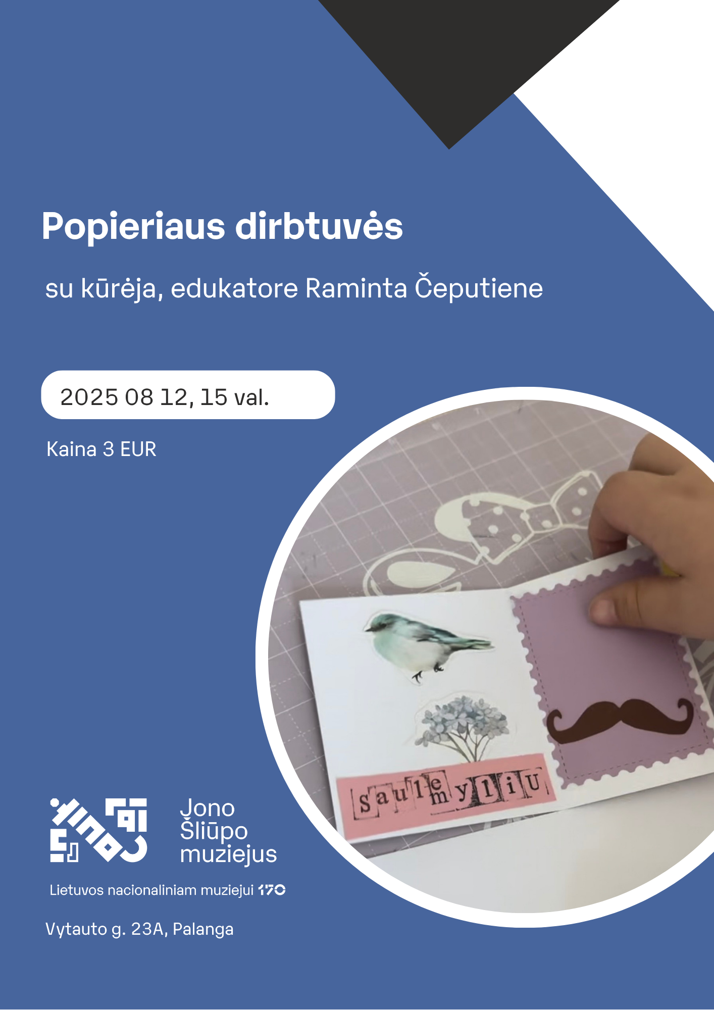 Rugpjūčio 12 d. 15 val. Lietuvos nacionalinio muziejaus padalinys Palangos burmistro Jono Šliūpo muziejus kviečia palangiškius ir miesto svečius kūrybiškam laisvalaikiui į popieriaus dirbtuves su muziejaus kūrybatorijos rezidente Raminta Čeputiene.