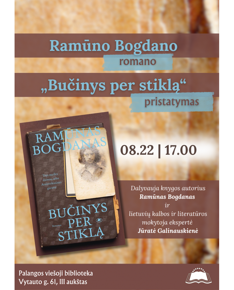 Rugpjūčio 22 d. 17 val. Palangos viešosios bibliotekos renginių salėje (IIIa.) vyks Ramūno Bogdano romano „Bučinys per stiklą. Trys meilės dainos, arba Atsisveikinimo giesmė“ pristatymas. Su autoriumi kalbėsis Palangos senosios gimnazijos lietuvių kalbos ir literatūros mokytoja ekspertė Jūratė Galinauskienė.