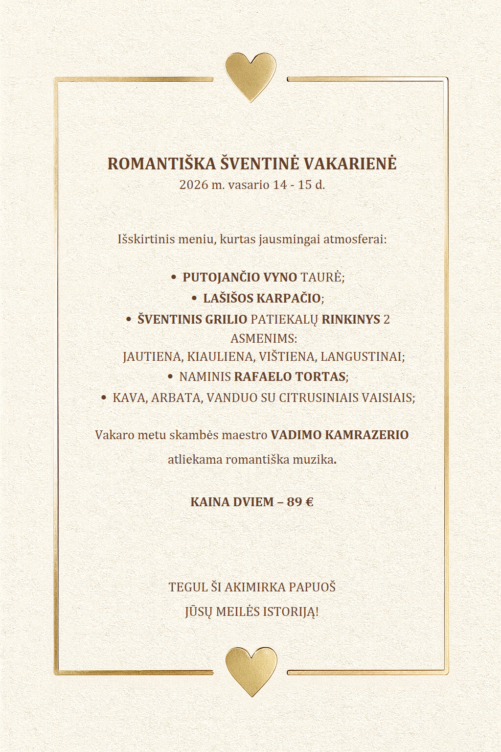 Vasario 14-ąją šventinė vakarienė ir gyvos muzikos vakaras su maestro Vadimu Kamrazeriu prie pat Baltijos bangų. Meilės melodijos, išskirtinis meniu ir jauki atmosfera viešbučio restorane!