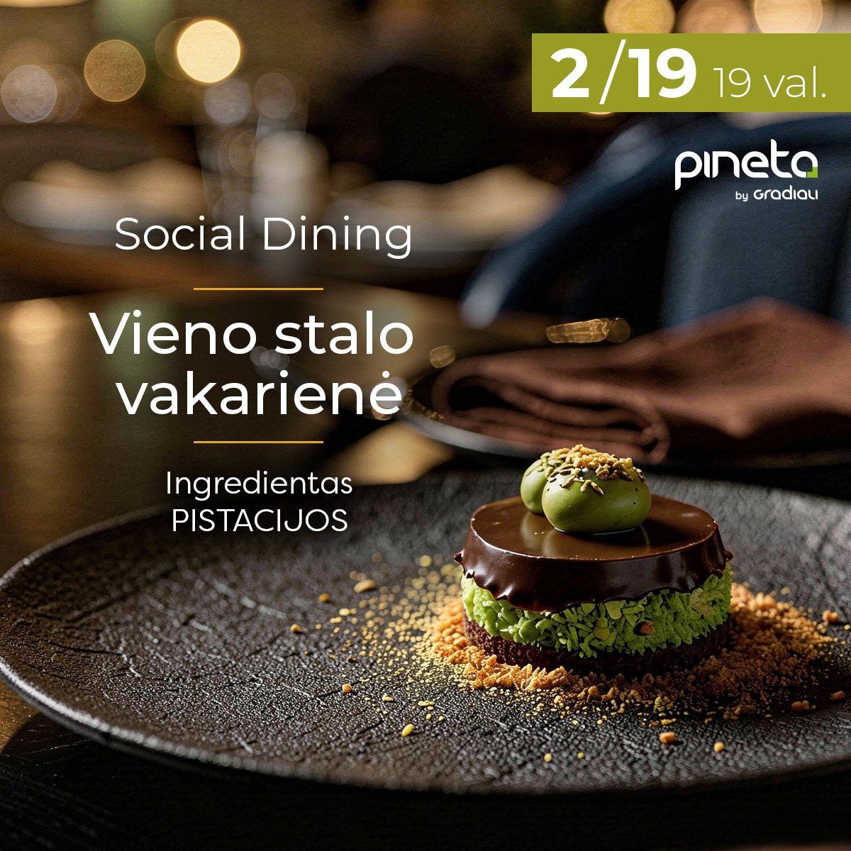 Kviečiame Jus į išskirtinę vieno bendro stalo vakarienę, kurioje susitinka nauji skoniai, pokalbiai ir bendrystė. Šįkart pagrindinis vakaro ingredientas – pistacija, kuri taps jungiamąja gija visame degustaciniame meniu – nuo užkandžio iki deserto. Kiekvienas patiekalas atskleis skirtingas pistacijos puses, kurios harmoningai dera su kruopščiai restorano šefo Justo Einos atrinktais ingredientais.